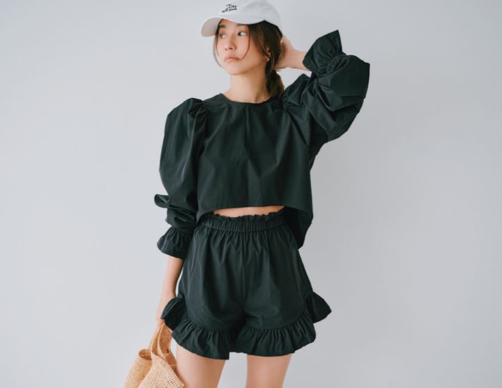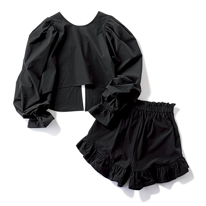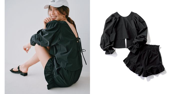 トップスは前後2wayで着られ、プールサイドだけでなく、公園などのアクティブシーンでも大活躍。ショートパンツはポケット付き。
