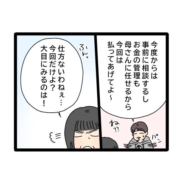 「今度からは事前に相談するし、お金の管理も母さんに任せるから、今回は払ってあげてよ~!ね??」