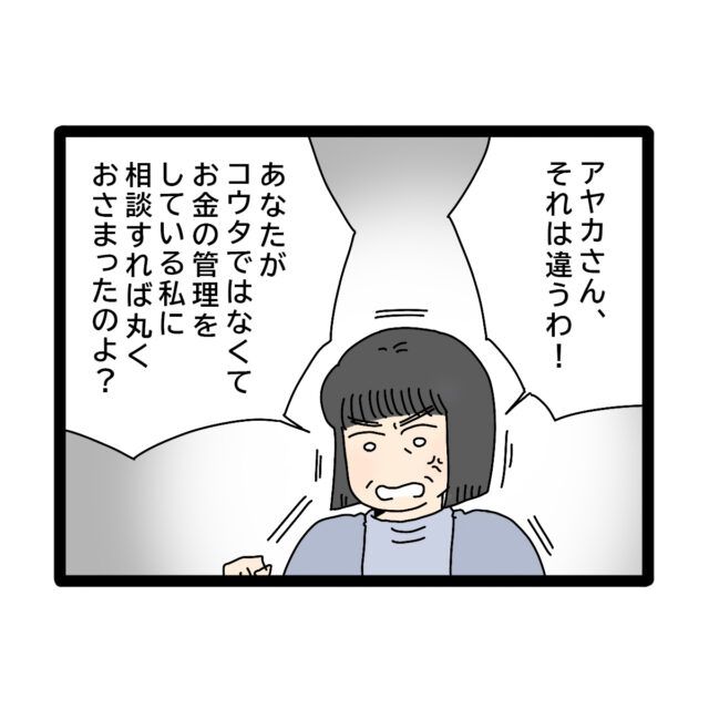 「アヤカさん、それは違うわ!あなたがコウタではなくて、お金の管理をしている私に相談すれば丸くおさまったのよ?」