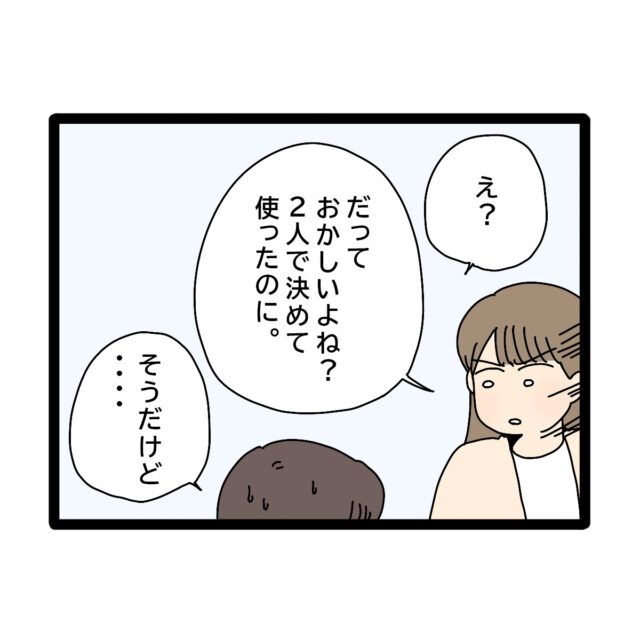 「何度も言うけど私に相談した上で、今まで通りコウタのカードで支払った旅行だったら、折半で全然問題なかったの!勝手なことをするからでしょ?」