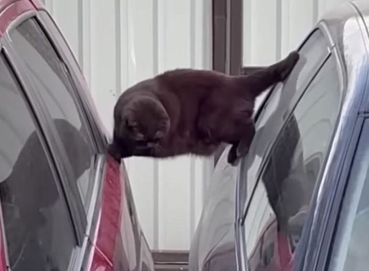 あぁ ハラハラする! 車の間で謎のチャレンジをしている猫さん。
