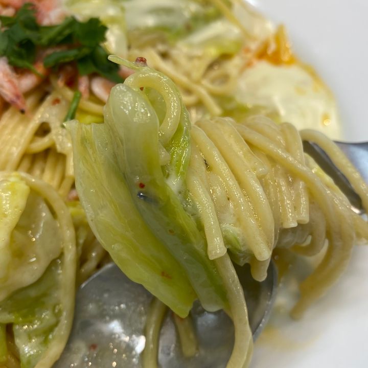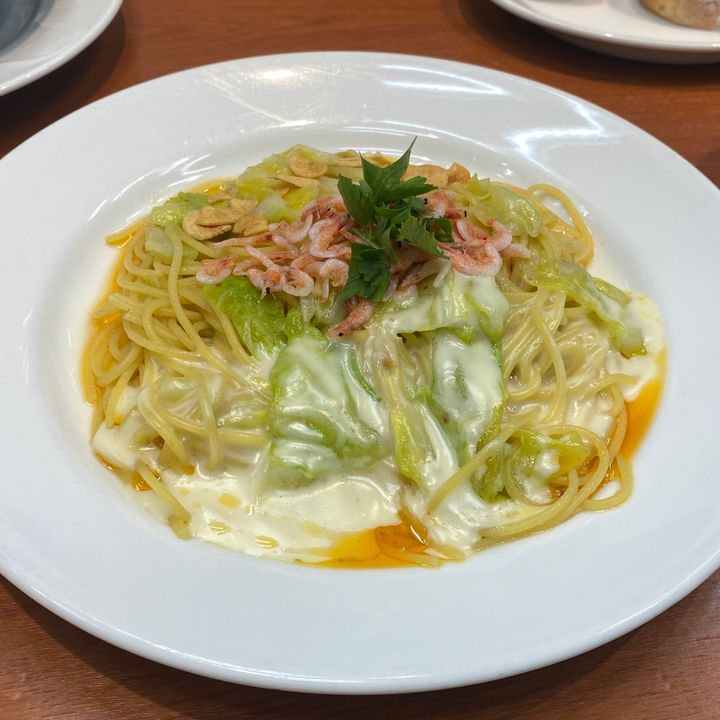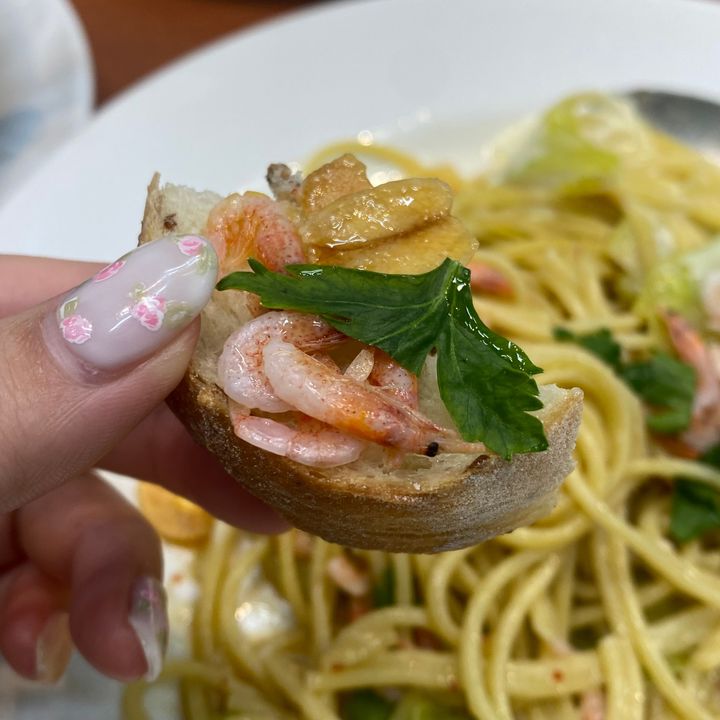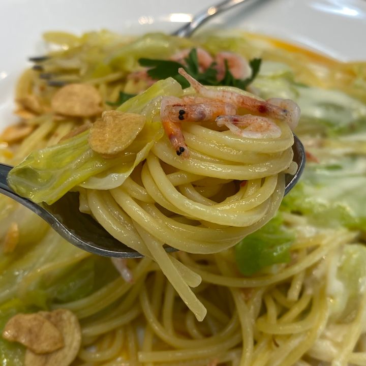 もちもちのパスタに香り高いサクッとした桜えび、パリパリ食感が楽しい一口です💭
