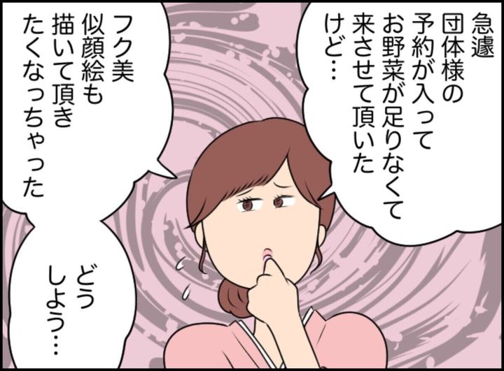 コースケと相談し、似顔絵を描くことにしたユメ。しかし、夫・ダイは八百屋で似顔絵なんてと怒り出してしまいます。どうにか説得を試みるユメですが、夫は猛反対。そこにひょっこり現れたのはなんと取引先の料亭の若女将・フク美でした。「面白そう」と笑顔で話すフク美を見てダイはかなり焦っている様子ですが大丈夫でしょうか…。