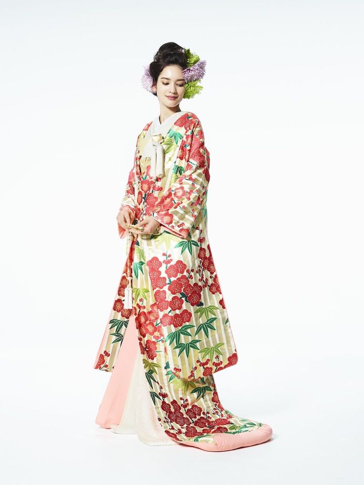 色打掛「白地竹林紅梅」レンタル料¥605,000(ハツコ エンドウ ウェディングス 銀座 tel.03-3563-1411)