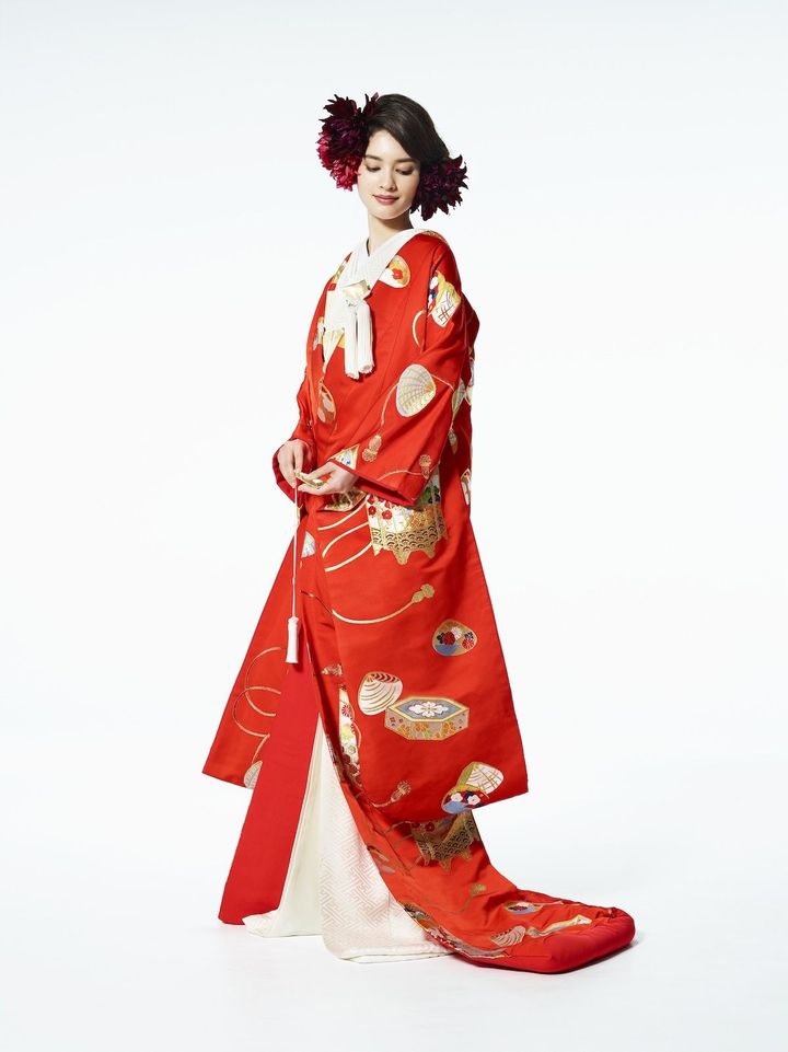 色打掛「赤地貝桶文」レンタル料¥880,000(ハツコ エンドウ ウェディングス 銀座 tel.03-3563-1411)