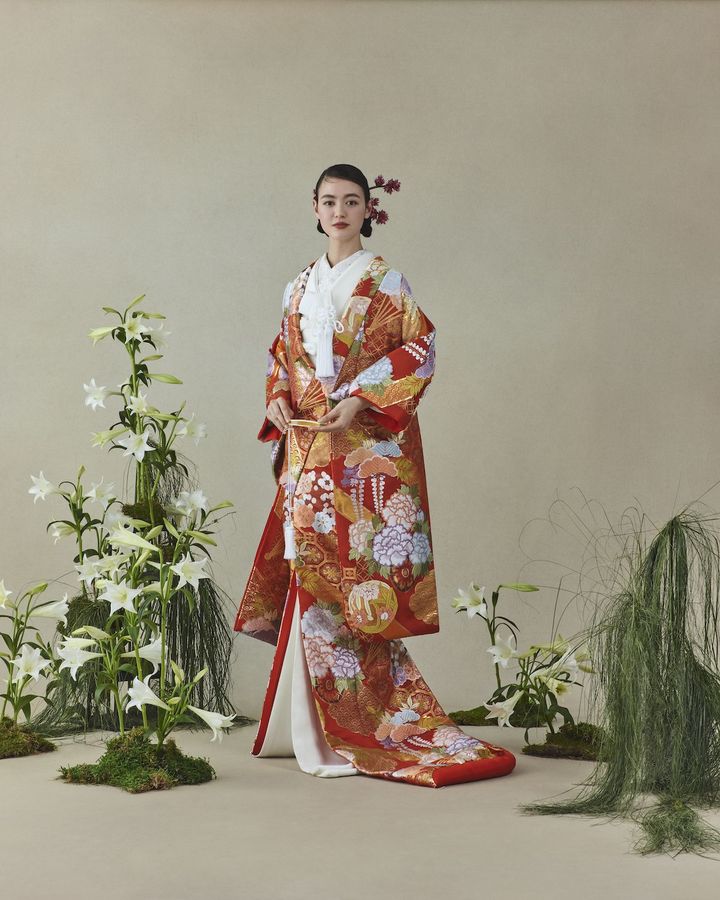 重厚で華やかな唐織の質感が花嫁を引き立てて