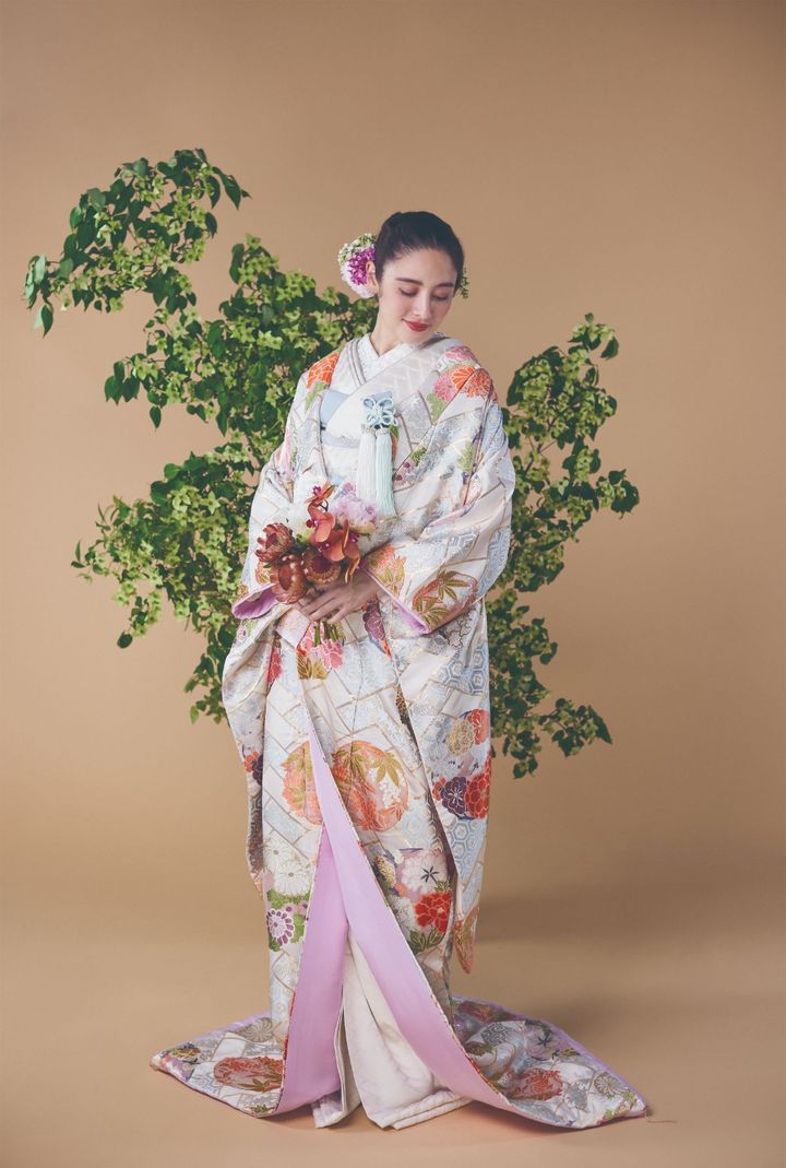 七宝、桐、菊などの吉祥文様を全身に配した一着。全体の配色を淡い中間色で揃えることで、ホテル挙式をはじめさまざまな会場に合わせやすいデザインとなっています。