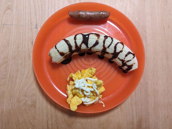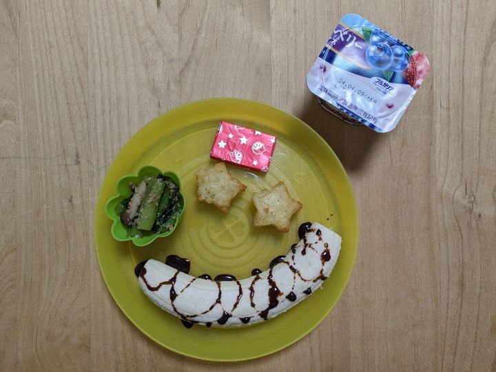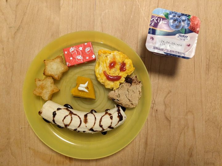 チョコバナナ、お星さまポテト、甘いチーズ、かぼちゃ、オムレツ、チョコチップクッキーのかけら、ヨーグルト。