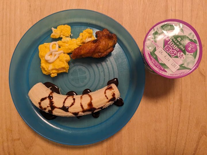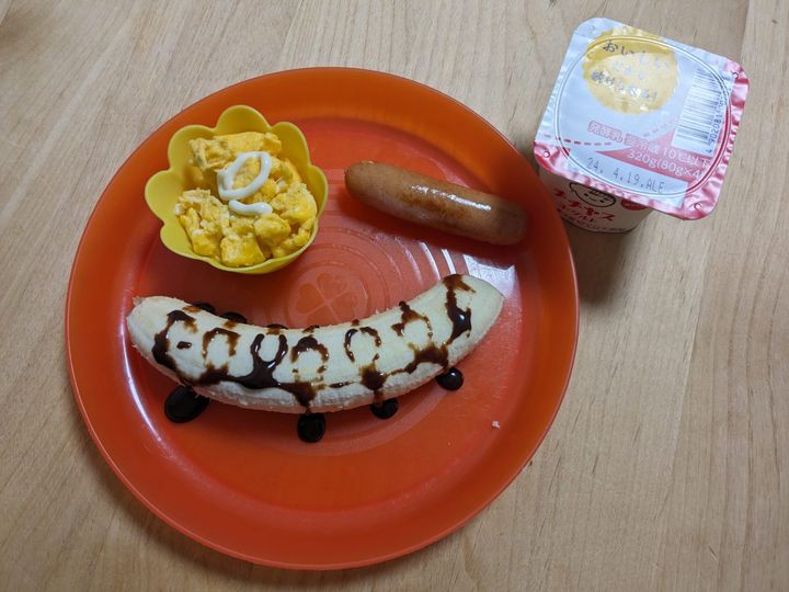 チョコバナナ、スクランブルエッグ、チキチキボーン、ヨーグルト。