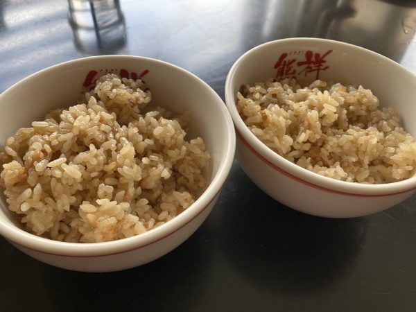 チケットを店長に渡し、席でゆっくりしているとすぐに出てきたのは炊き込みご飯!ランチ時間はらーめんにご飯のサービスが付くのお得です!
