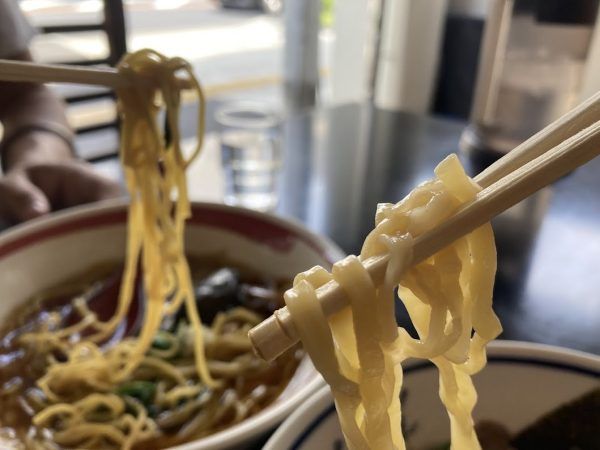 写真奥の”らーめん”は細身の丸麺で、手前の”かなで”がちょっと縮れた中太平麺です。”かなで”の方がスープが絡みやすい感じですかね〜。