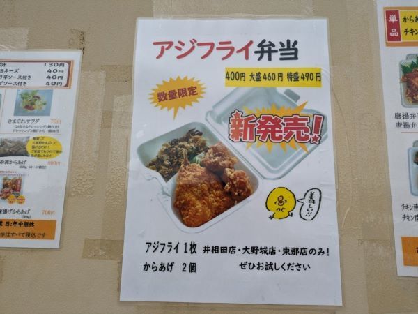上の写真にも写っていますが、アジフライもあるんです。アジフライを販売しているのは、大野城店を含めて3店舗だけです。アジフライ弁当は大きさが選べますが、おかずのみはありませんので(他のお弁当はおかずのみ可)お気を付けくださいね。