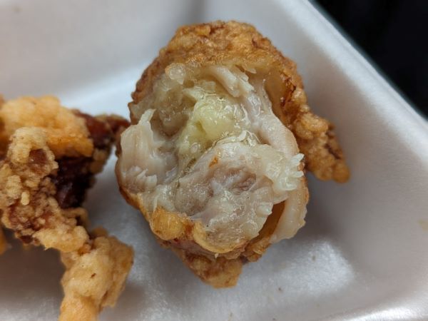 まずはキャベツたっぷりのお惣菜からいただいてみます。しんなり柔らかくて、あっさりしていて止まらないおいしさです。青菜やクラッシュしたピーナッツも良いアクセントになっていて大満足♪ そしてアツアツのからあげは、カリッとジューシーでお肉にしっかりと味が染みていています。「醤油ベースににんにく・生姜をきかせ何種類もの調味料をまぜ合わせ、甘さ・塩辛さ・酸味・香り、共に抜群の配合で調理した自家製秘伝だれに漬け込んでいる」というだけあって、これを目当てに並ぶ人が多いのも納得です。そして衣が薄いのも、嬉しいポイント♪片栗粉で揚げることで、たれと粉がほどよく絡み合い、衣がサクサクで中はジューシーなおいしい食感に仕上げているそうです。