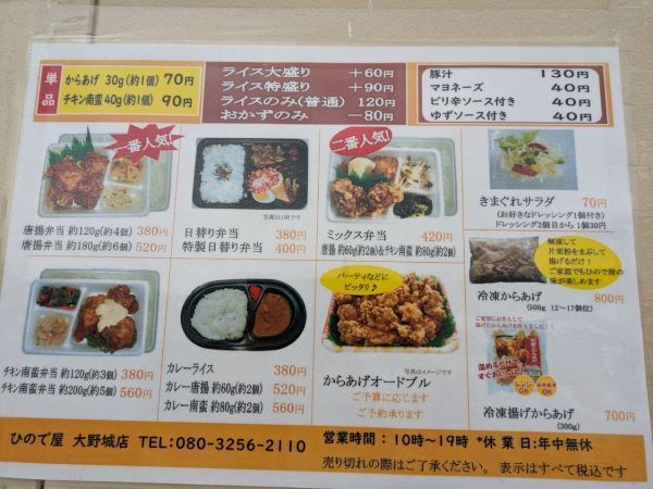 ・お弁当のひので屋(おべんとうのひのでや) 大野城店 ・大野城市御笠川5丁目6-5 ・080-3256-2110 ・10:00~19:00 ・定休日 なし ・お弁当のひので屋(日之出屋)|福岡県を中心に、からあげ弁当、チキン南蛮弁当、カレーライス、日替り弁当を3 30円でご提供!弁当の「ひので屋」です。|福岡|博多区|大野城|筑紫野|志免|久留米|千葉 (hinode-ya.jp)