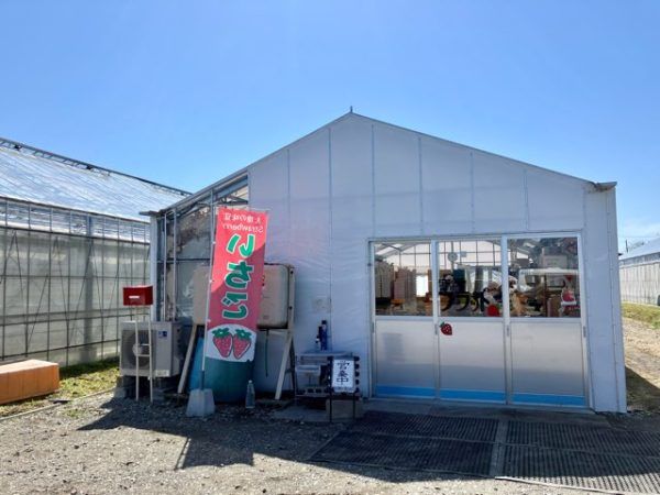 いちごソフトクリームの原料にもなっている、おいしいいちご「もういっこ」を見てみたいと思い、道の駅米山から約1.5kmの場所にあるいちごの直売所(株)フラットに行ってみました。