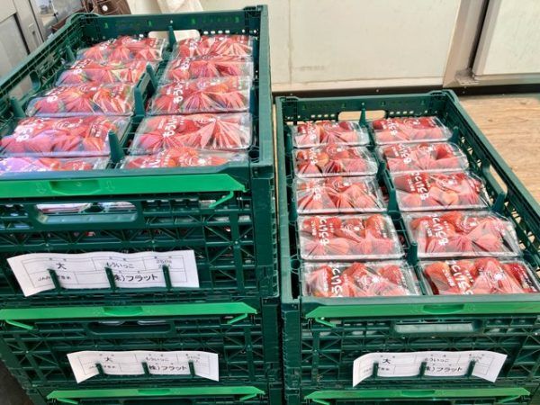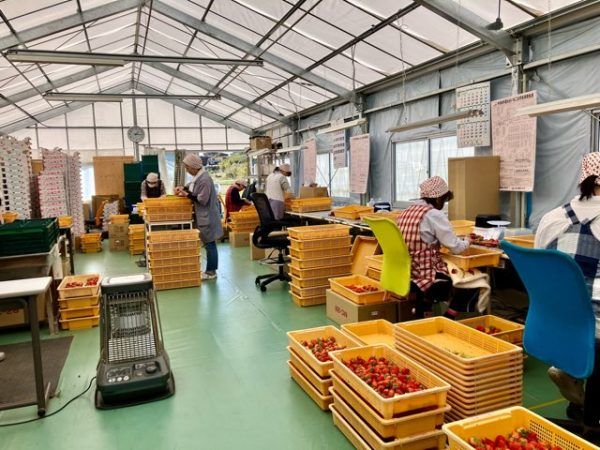 入口を入ったところが受付です(直売所の営業時間は10時から15時です。いちごの在庫数により営業時間が変わることがあります)。受付で購入の旨を話すととても親切に応対してくれました。 店の奥では9人のスタッフの方々が、それぞれの場所で「もういっこ」をひとつひとつていねいに選別し梱包していました。