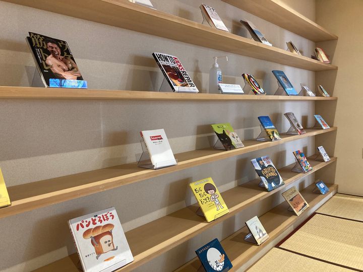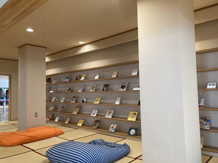 一見普通の bookshelf に見えますが、下段には絵本、上段には大人向けの本が並んでいます。乳幼児が手に取りやすいように配置されているのはもちろん、ゴロンと横になれる畳敷きとYogiboもあり、親子で読書を楽しむことができます。