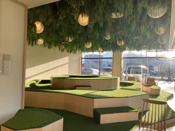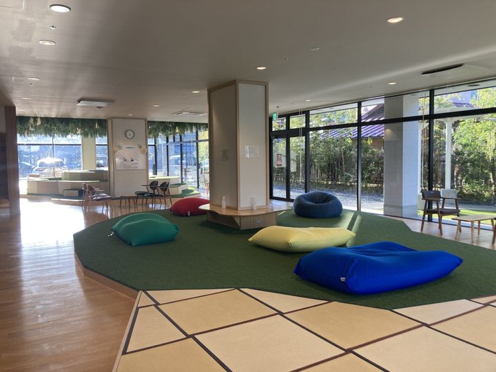 1Fには、人工芝やローテーブル、Yogiboが置かれたくつろぎスペースがあります。館内は全て裸足なので、靴を脱いでリラックスできるのが嬉しいポイント。小さな子どもたちも安心して過ごせることができます。