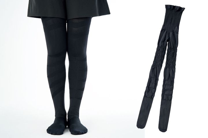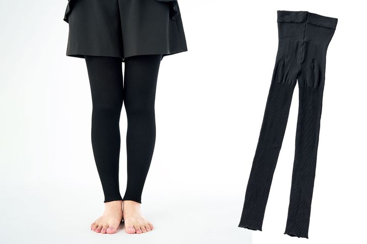 ベルミスならではの強着圧と独自技術の6Dスパイラル構造で巡りをサポート。スッキリ軽やかな脚にギュギュッと引き締め。ベルミス スリムタイツ¥4,390(ファストノット)