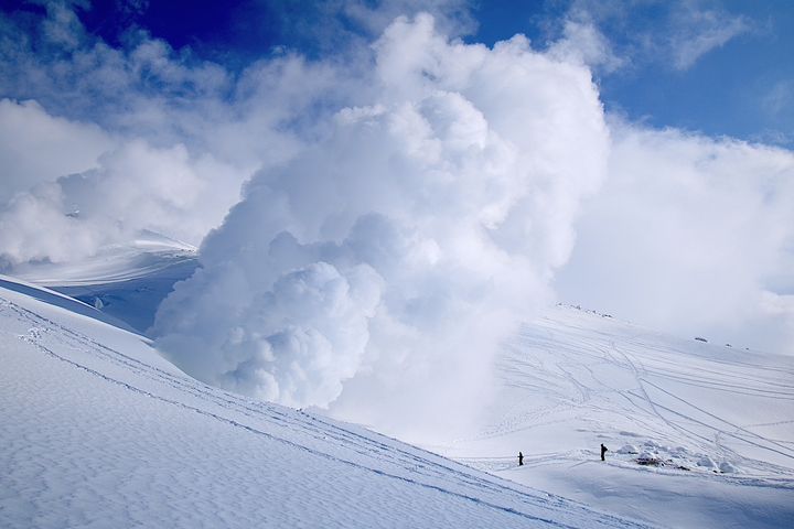 ロープウェイを降りれば、火山ガスが噴き出る真っ白な山体に、見渡す限りの広大な雪原。ワカンやスノーシューといった専用の装備を履き、ひたすらに白銀の世界を歩きます。