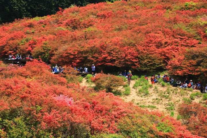 魅力は、5月上旬から山頂一帯で見頃を迎える「ヤマツツジの大群落」。"一目百万本"とも称され、山肌が一面赤く染まる風景は、思わず言葉を失うほど鮮烈です。