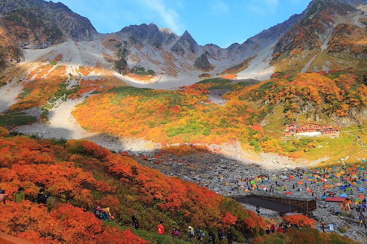 日本一の山岳紅葉といっても過言ではない北アルプス「涸沢(からさわ)カール」。穂高連峰に囲まれた場所に形成されている氷河地形で、上高地から片道約6時間ほどでアクセスすることができます。