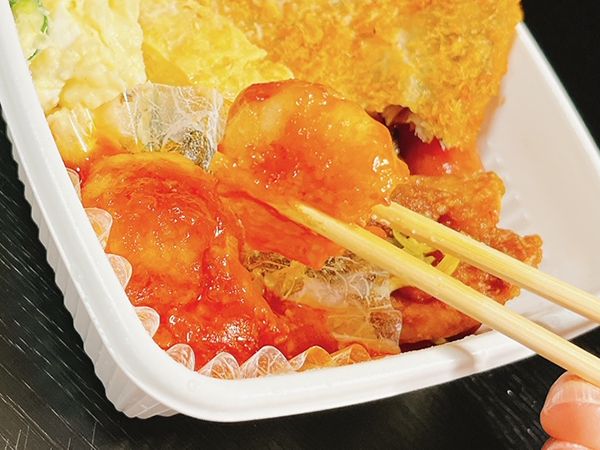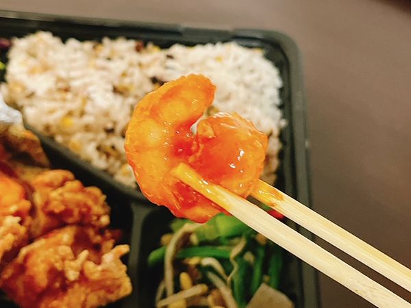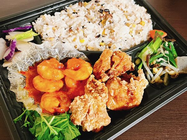 エビチリと鶏唐揚げ弁当 750円(白米) (+30円で雑穀米)にしてみました