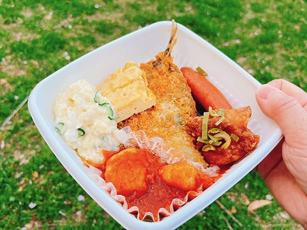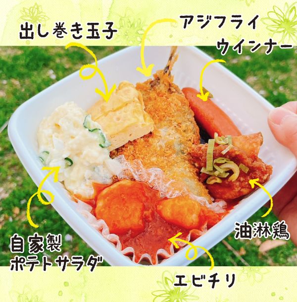 ①白身魚フライ(ソース付)¥150 ②エビチリ(3尾)¥230 ③出し巻き玉子(1切)¥70 ④ウインナー(1本) ¥90 ⑤鶏のから揚げ(1個)¥90 ⑥豚の生姜焼き¥180 ⑦アジフライ(1尾)¥160 ⑧ミニハンバーグ¥100 ⑨油淋鶏(ユーリンチー)(1個)¥90 ⑩チキンカツ(ミニ)ソース付 ¥90 ⑪自家製ポテトサラダ ¥50 ⑫手仕込みカレー春巻き ¥130 ⑬サバの塩焼き(約40g)¥130 ⑭麻婆豆腐¥100 ⑮コロッケ1個¥150 ⑯タルタルソース15g¥50