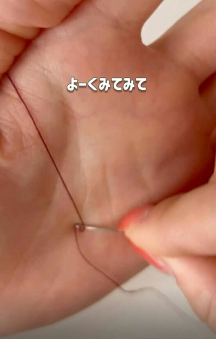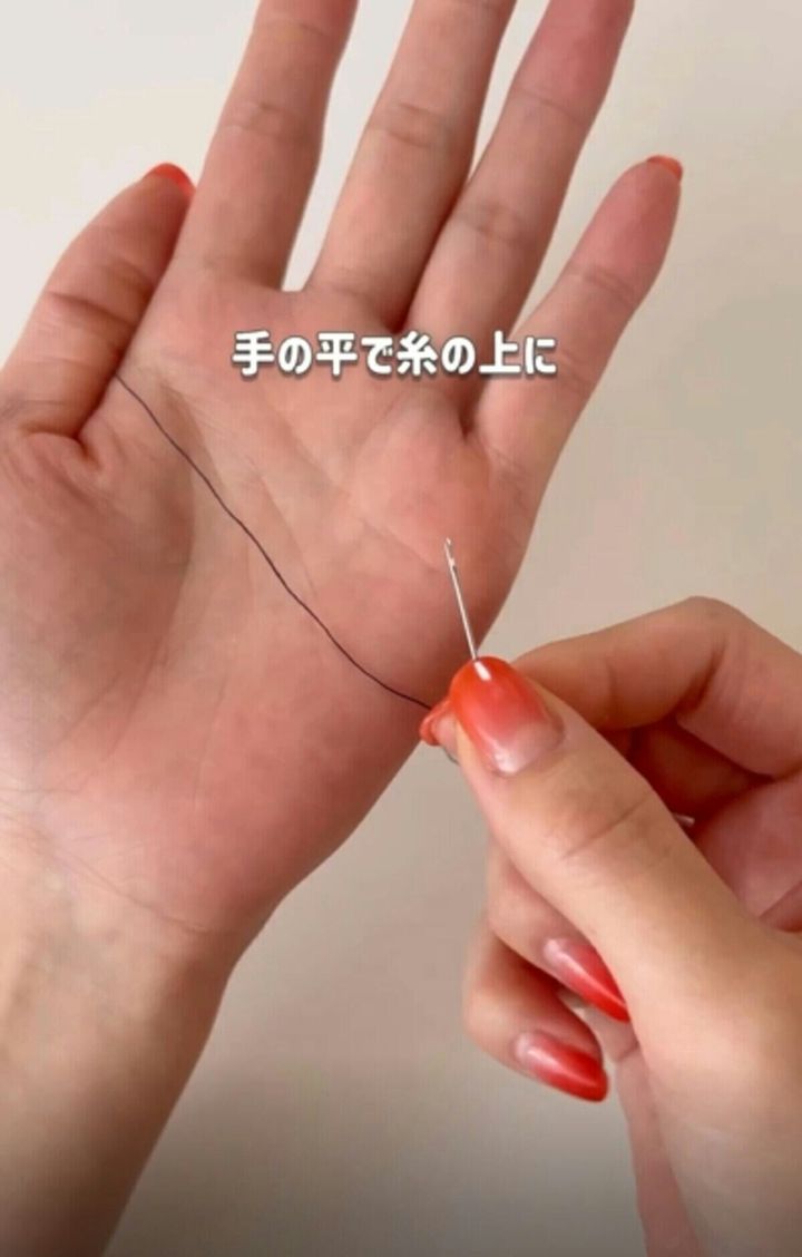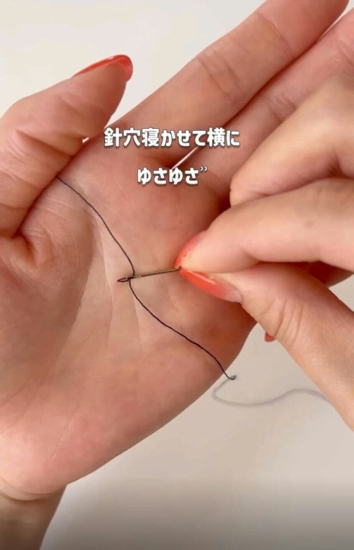 糸を置いた手の平の上で、針穴を横に揺らすように動かします。