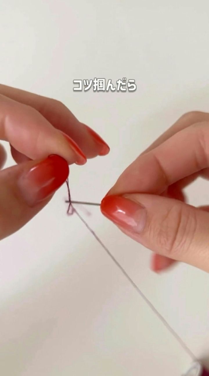 針を利き手に持ち、針穴を寝かせて糸の上に置くようにして、横向きに揺らすように動かします。