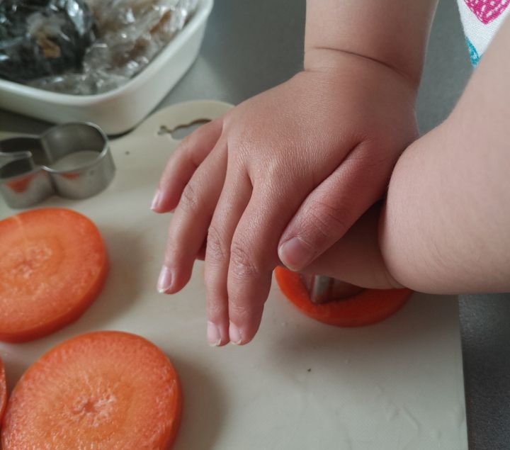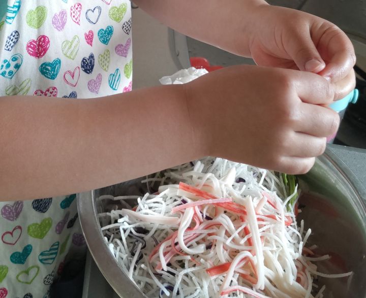 人参の型抜き、サラダにカニカマや調味料を混ぜる、などの簡単な作業は進んでやってくれました。