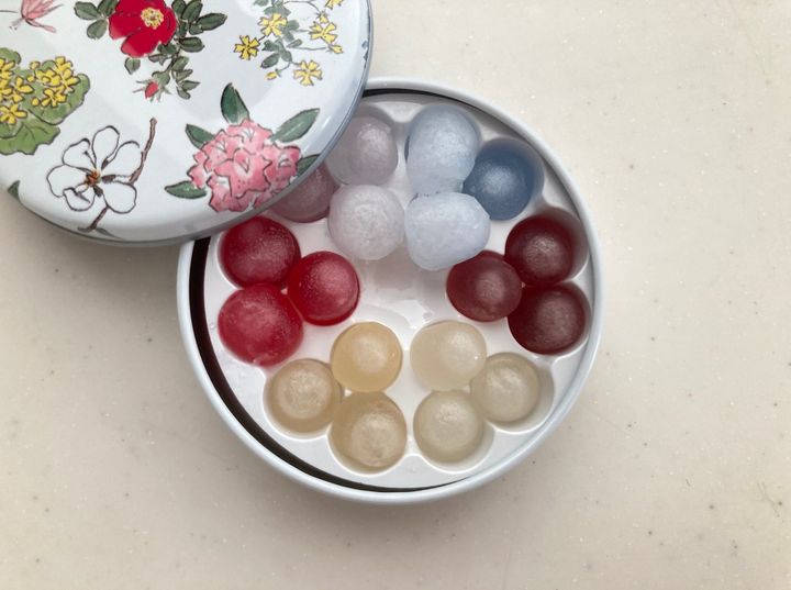 色とりどりの宝石のような小指サイズほどの小さな飴が入っていて思わず目を惹かれます。
