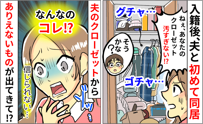 夫との交際期間は5年ほどと長かったのですが、同棲はしたことがありませんでした。そのため入籍後に初めて同居をして、私は夫が片付けが苦手だということに気づき始めたのです。そして私はある日、夫のクローゼットから信じられない物を発見し……!?