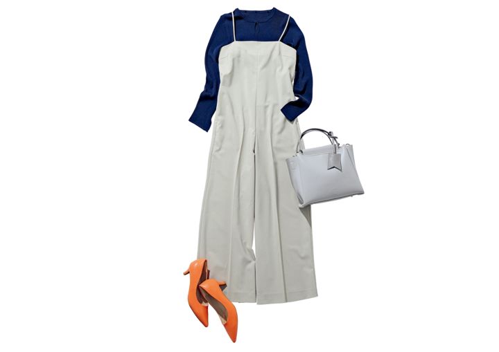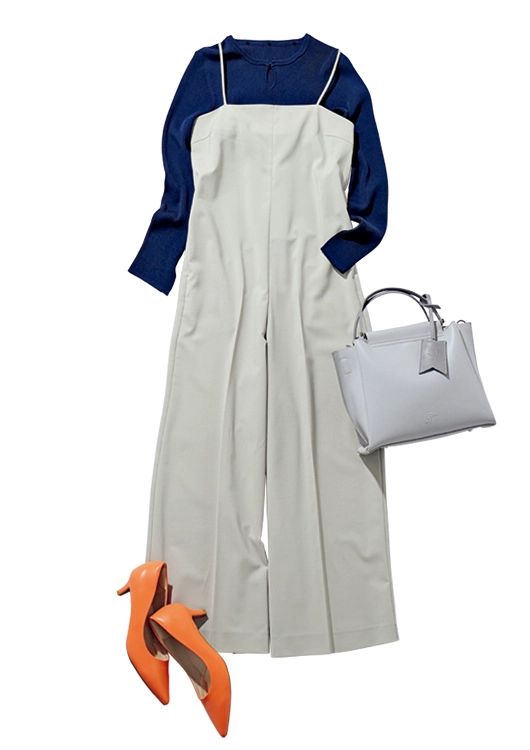 セットアップ(サロペット)¥12,980/アンフィーロ(オンワード樫山) 襟付きリブニット¥8,470/NATURAL BEAUTY BASIC 2WAYボストン¥6,996/デッサン(ワールド) ポインテッドトウパンプス¥7,500/オリエンタルトラフィック(ダブルエー)