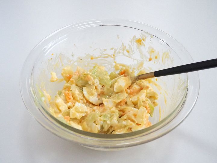 2. ゆで卵とAをボウルに加え、ゆで卵を潰しながら混ぜる。そこに1の春キャベツを加えて混ぜる。