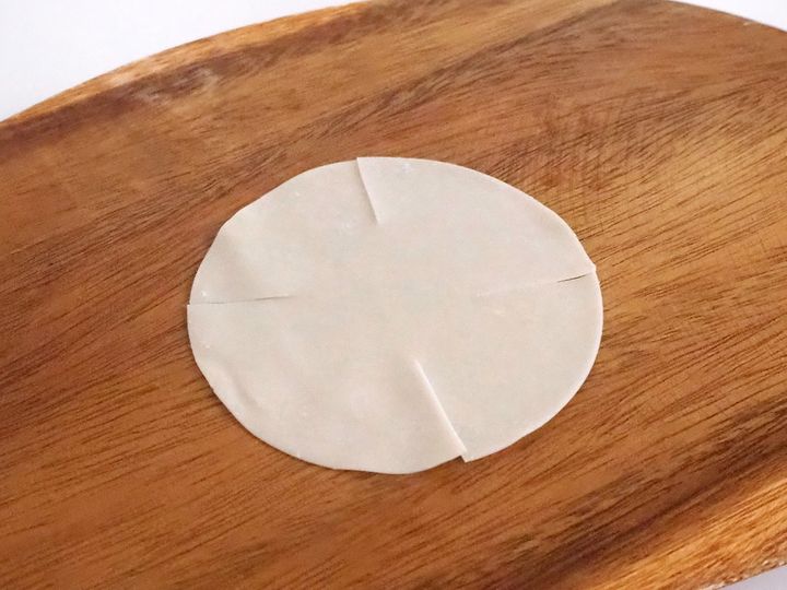 3. 餃子の皮の上下、左右に3cmほど切り込みを入れる。