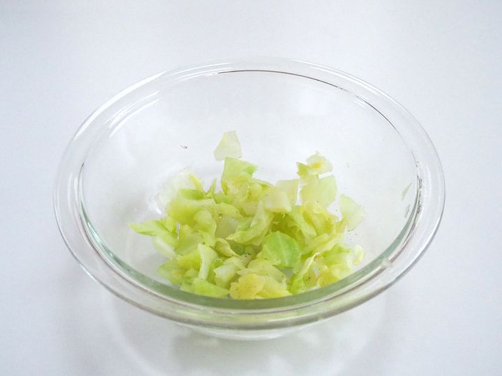 1. 春キャベツを約1cm大の小角に切る。耐熱ボウルに加え、ラップをして電子レンジ(600W)で2分半加熱する。取り出したら粗熱を取り、軽く絞る。塩こしょうで下味をつける。
