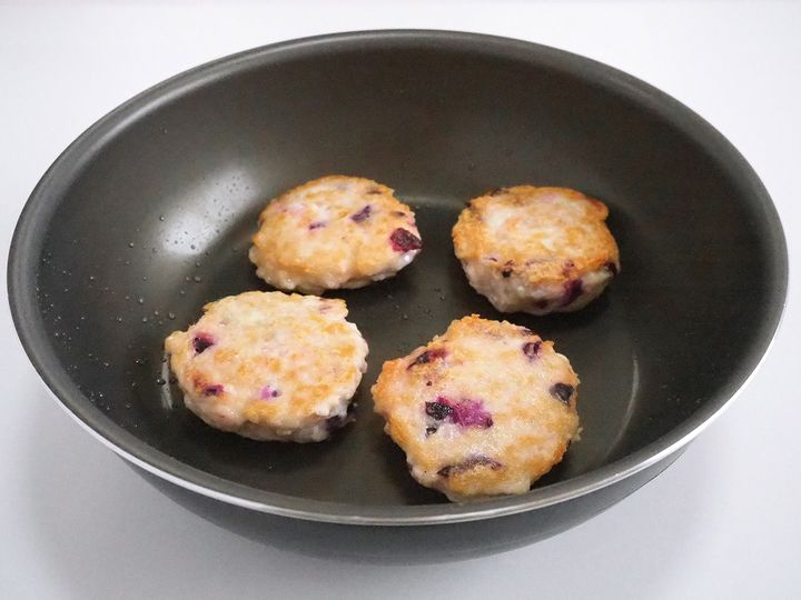 3. フライパンに2を4等分にして加え、スプーンで楕円型に形成する。油を適量加えて中火で4分程度加熱する。焼き目がついたらひっくり返し、蓋をして2分蒸し焼きにする。