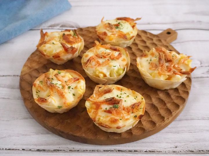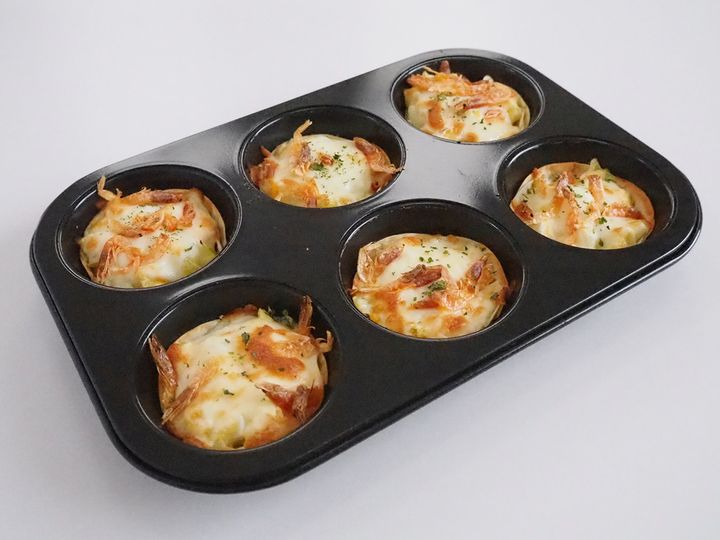 餃子の皮をカップにしたかわいらしい見た目の新感覚のデリ。中には、マヨネーズで和えた春キャベツとクラッシュしたゆで卵を詰め、チーズと桜えびをのせてトースターで焼き上げました。