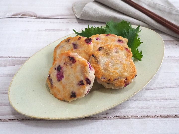 ふんわりやわらかい鶏つくねに、ピンク色のしば漬けを入れて華やかに! しば漬けのコリコリとした食感もアクセントになっています。
