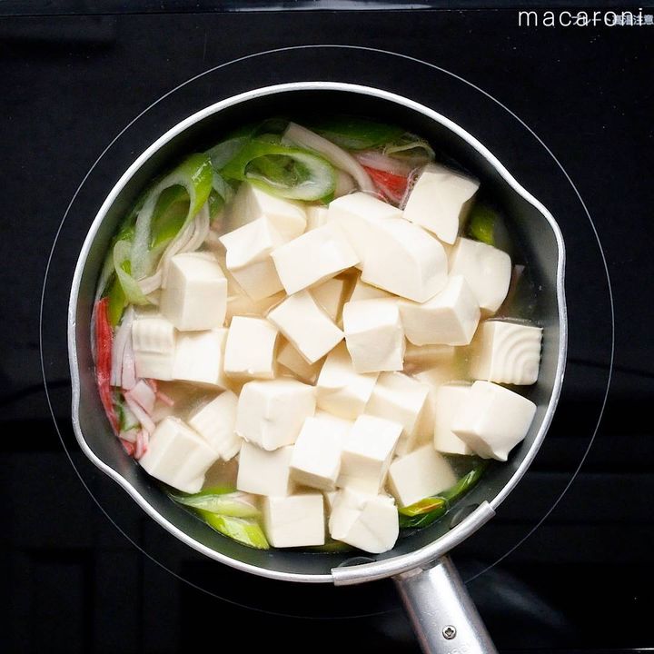 3: 水、鶏がらスープの素、酒、カニカマを加えて沸騰したら豆腐を加えます。