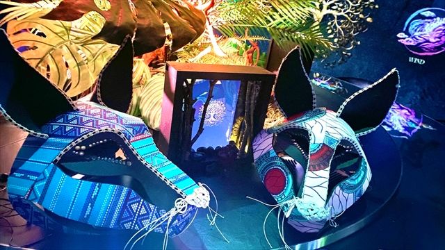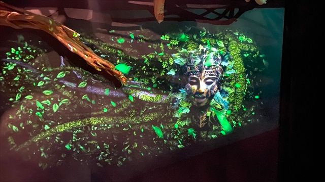 ここまではプロローグ。水で口を清めたあと移動したお部屋には、木の幹を思わせるような素敵な装飾が。四方を囲む壁面にはプロジェクションマッピングが映し出され、幻想的なアート空間となっています。
