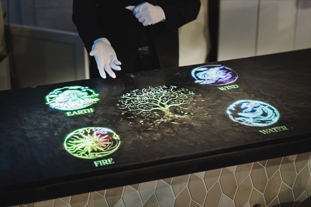地下で最初に案内されたお部屋では、木の精霊が現れ、私たちに語りかけてきます。それと同時に、これから始まる料理のテーマ「土、火、水、風、世界」に合わせたプロジェクションマッピングが、次々と枯山水を模したテーブルに投影され、私たちの目を楽しませてくれます。