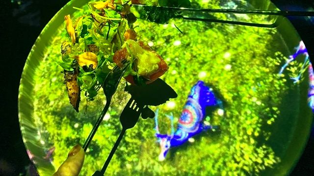 動物が動くなか、ナイフとフォークでサラダをいただくという、なんとも不思議な体験……。写真で見ると、グリーンのお皿のように見えますが、このお皿自体はグレーのシンプルなもの。本物のサラダ以外は、すべてプロジェクションマッピングで映し出されているんです。なるほど、これが食べるアート体験ということなんですね!