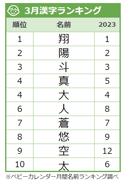 < 3月生まれ >人気の漢字ランキングTOP10