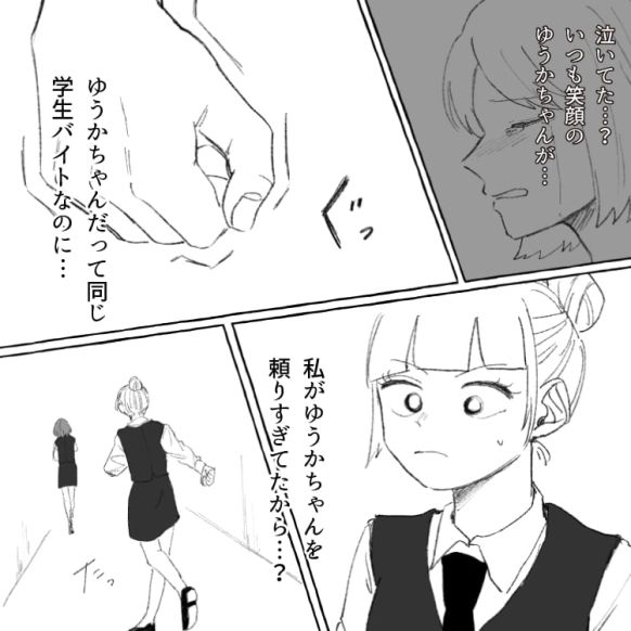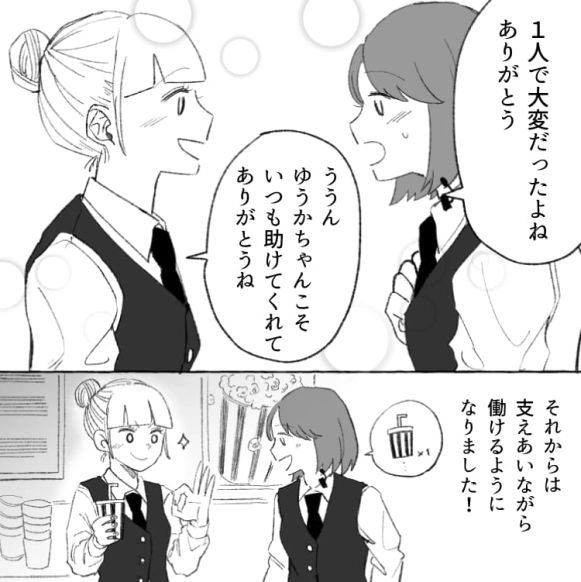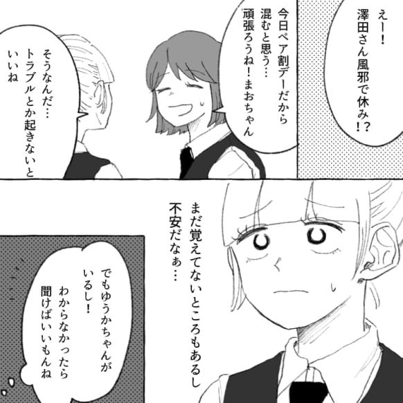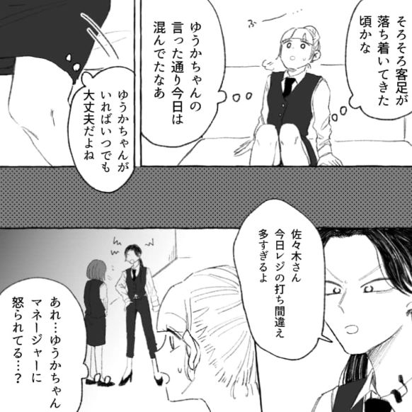 支配人やマネージャーは怖くて厳しいなか、やさしく教えてくれる同僚のゆうかちゃんは、主人公にとって頼りになる存在でした。