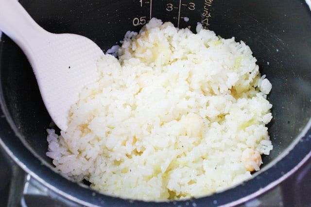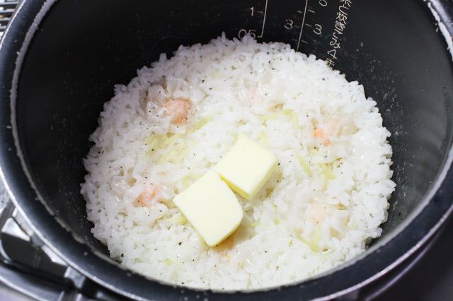 4.炊けたらバターを加えて混ぜ、塩とこしょうで味を調えます。