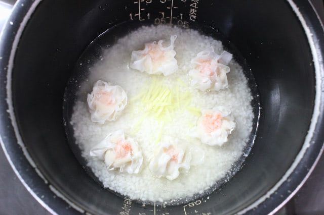 3.炊飯器にお米、水、しょうが、凍ったままのエビ焼売、丸鶏がらスープを加えて普通モードで炊きます。