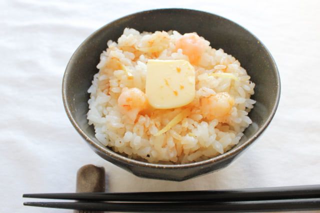 バターが全体に行きわたるように混ぜると、エビピラフそっくりの香りがふわ~っと広がりました♪器に盛ってトッピング用のバターを乗せてしょうゆをかけたら完成です!