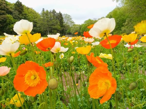 明るい黄色、白、オレンジの三色のポピーは、見ているだけで元気になりそうなビタミンカラー!時折、風にゆらゆら揺れる花々がとても可愛いです。見頃は、4月下旬まで続く見込み。